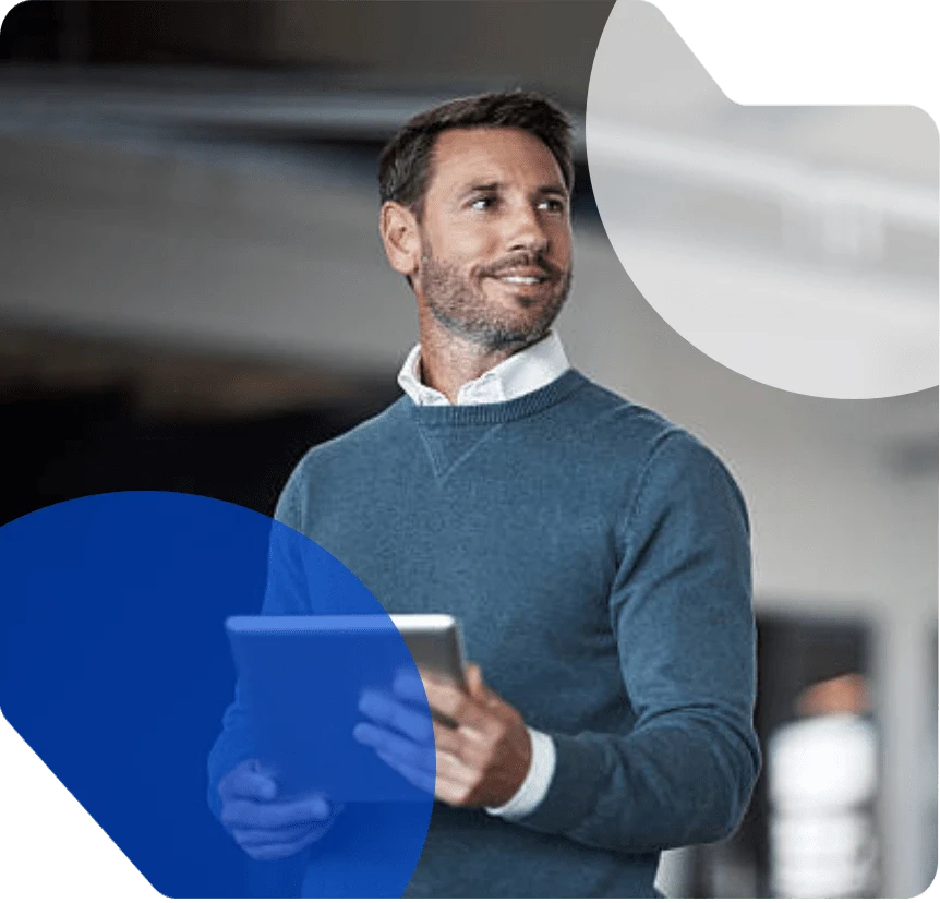 Professional team member holding a tablet and smiling in a modern office, representing creative web design Kandy services.
