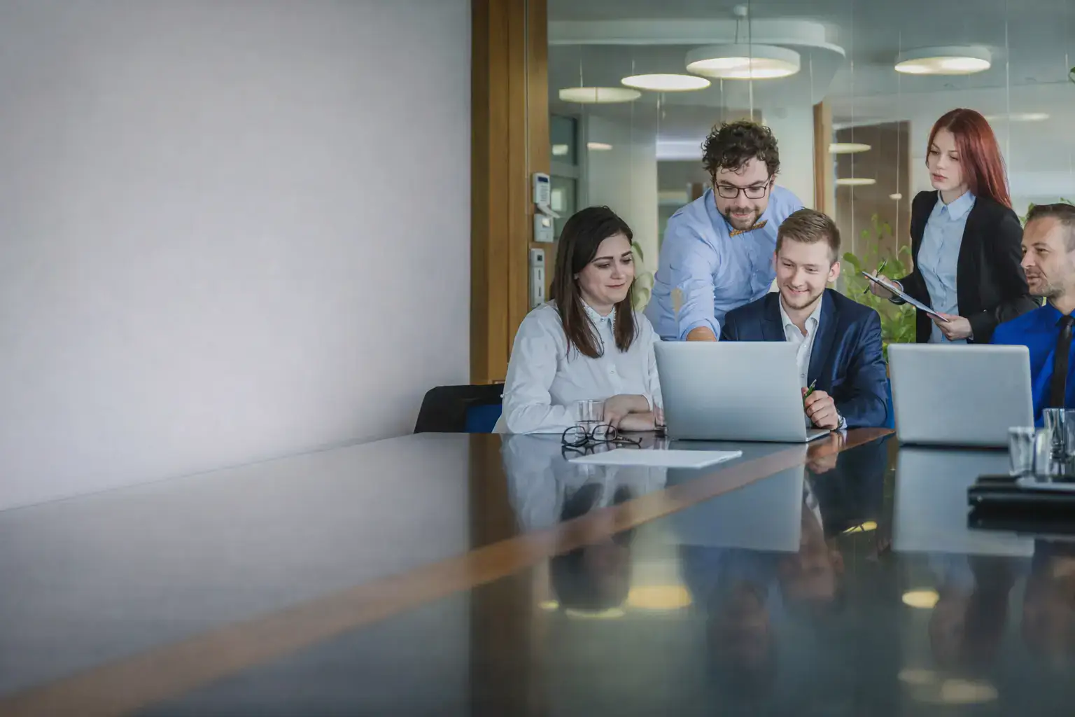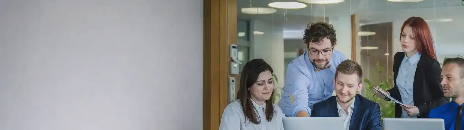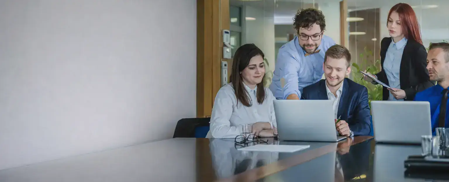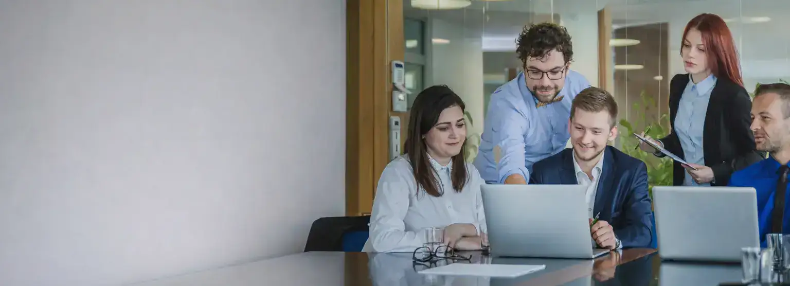Business team collaborating and discussing ideas while working on a laptop
